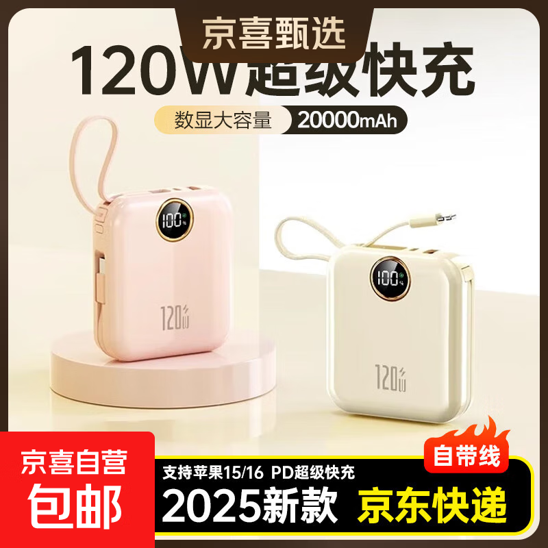 快充自带线充电宝3C认证1/20000毫安便携可上飞机小巧迷你超大容量移动电源适用于苹果17小米华为5 象牙白【旗舰款/进口提速电芯】快充/自带线 20000ma