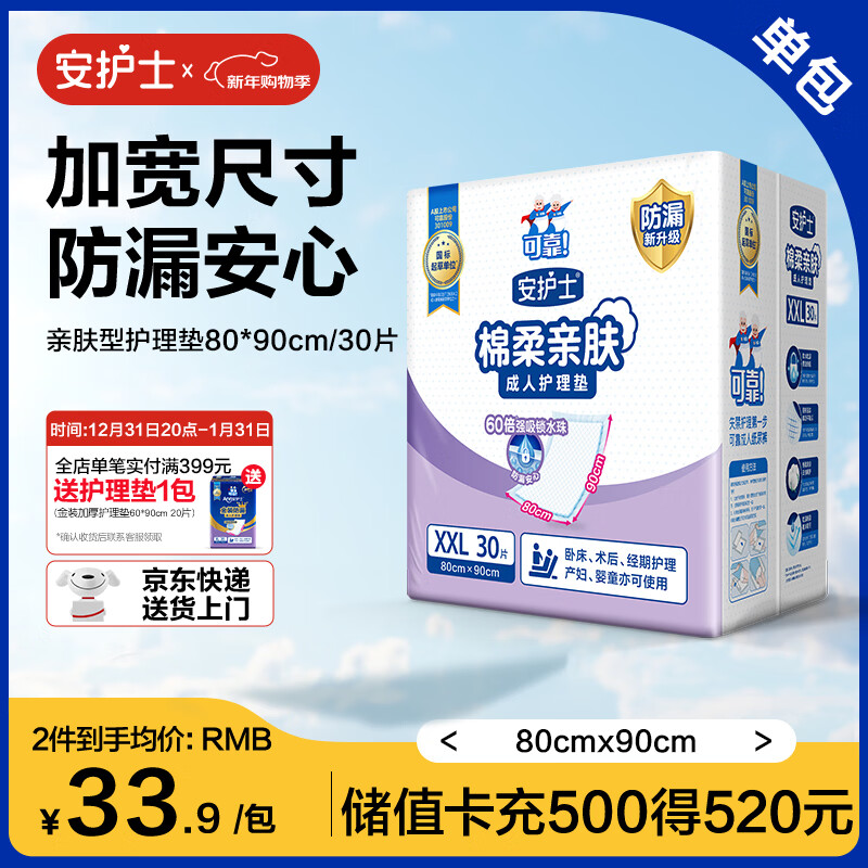 安护士成人护理垫(尺寸:80*90cm)30片 孕妇产褥垫多功能老年人隔尿垫