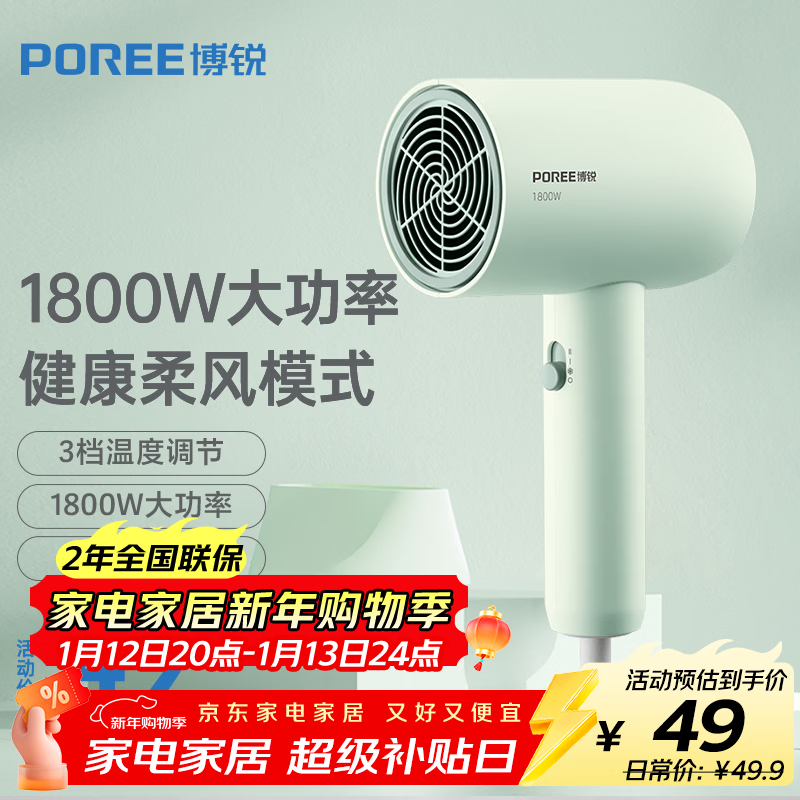 飞科博锐电吹风机家用便携吹风筒宿舍用1800W大功率风筒冷热风三档吹风 嫩绿PH1622