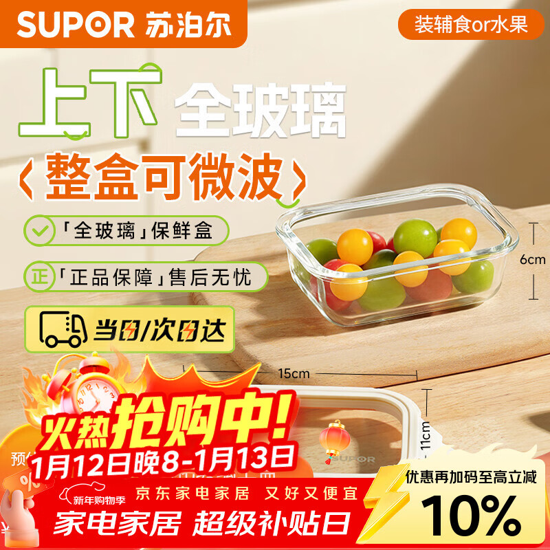 苏泊尔(SUPOR)保鲜盒玻璃饭盒上班族微波炉加热便当盒专用学生餐盒400ml奶酪白