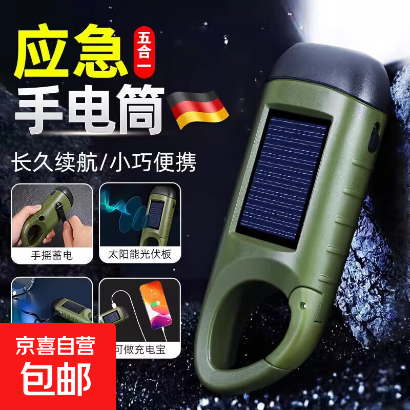 德国手电筒充电手摇太阳能强光可携式超亮家用多功能移动充小手灯 森绿【升级五合一款】太阳能/手摇/USB充电