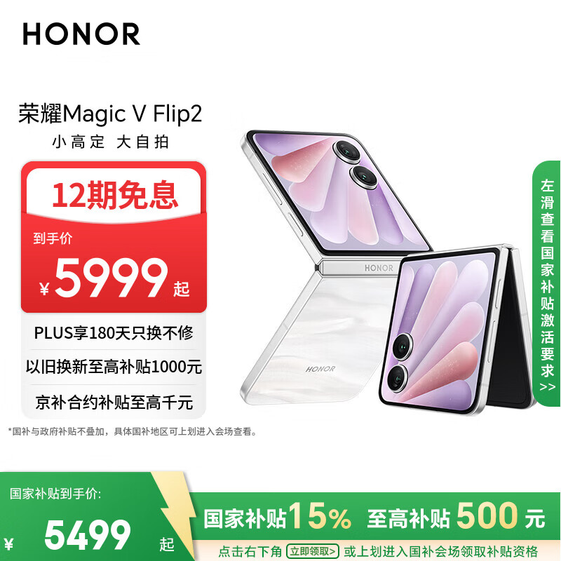 荣耀Magic V Flip2 小折叠屏 国家补贴 AI 2亿写真自拍 5500mAh青海湖电池 12+512月影白 拍照 5G手机