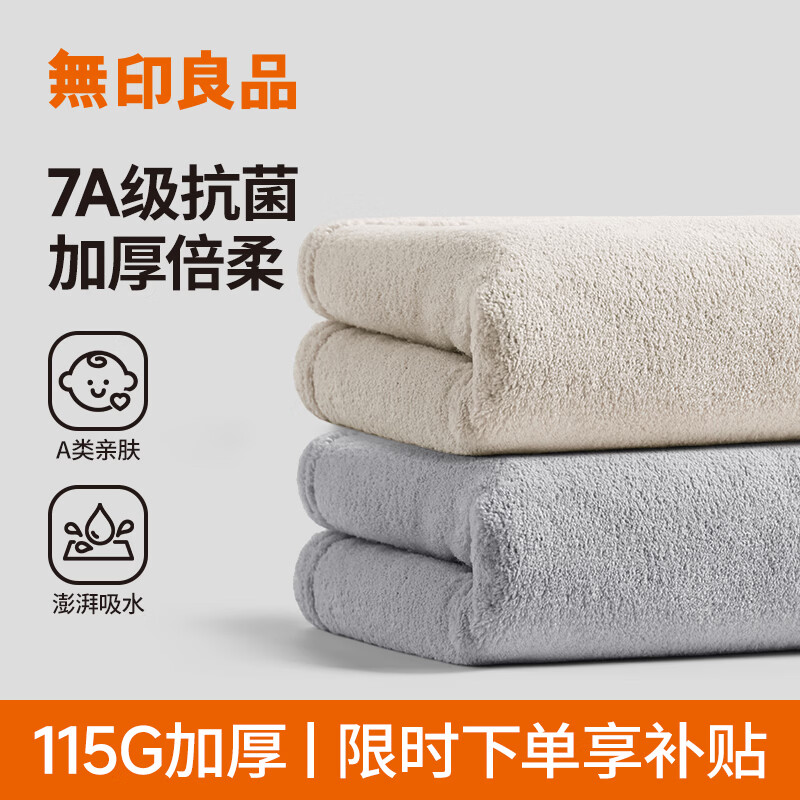 无印良品毛巾7A级抗菌强吸水不易掉毛男士加厚2条装A类洗脸大毛巾115g/条