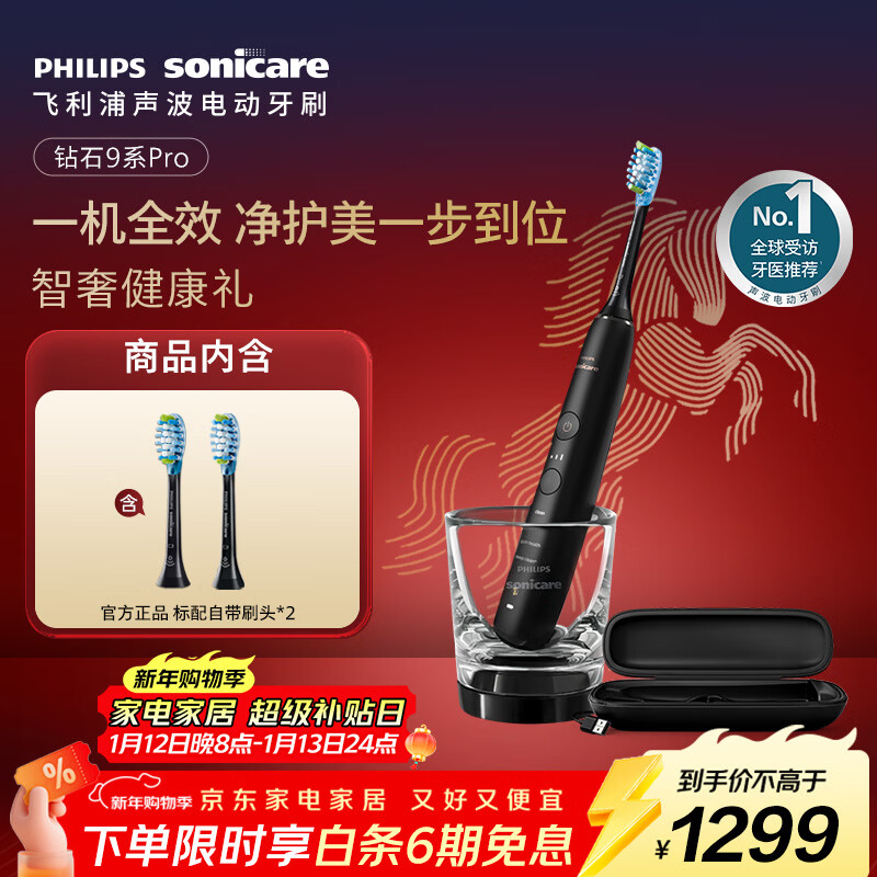 飞利浦(PHILIPS)声波电动牙刷钻石9系Pro 生日礼物 年货节礼物 情人节情侣款 送男生女友 充电旅行盒 HX9912/77黑