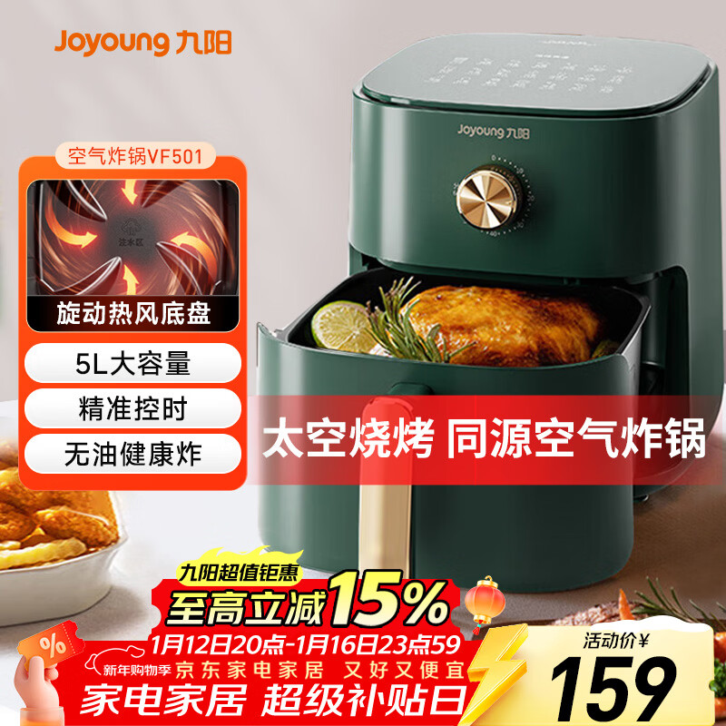 九阳(Joyoung)空气炸锅家用 5L大容量不沾易清洗 蒸汽嫩烤准确定时无油煎炸 薯条机蒸烤一体机 KL45-VF501