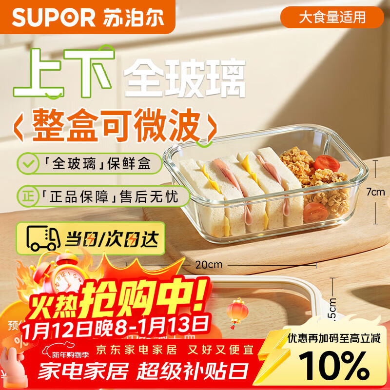 苏泊尔(SUPOR)保鲜盒玻璃饭盒上班族微波炉加热便当盒专用学生餐盒1100ml奶酪白