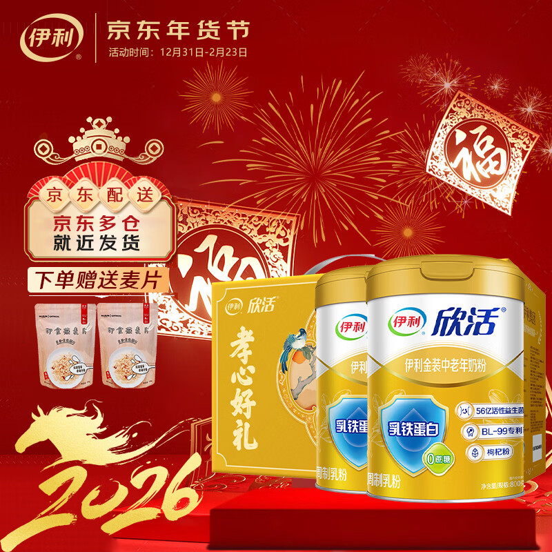 伊利欣活金装中老年奶粉800g*2罐礼盒装高钙益生菌 乳铁蛋白 年货送礼