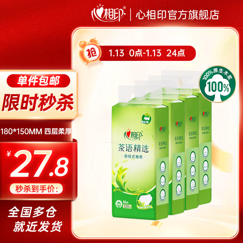 心相印悬挂式抽纸4层320抽厚实感压花挂墙式纸巾卫生纸厕纸墙壁挂式抽纸 【箱装送挂钩】4层320抽*4提