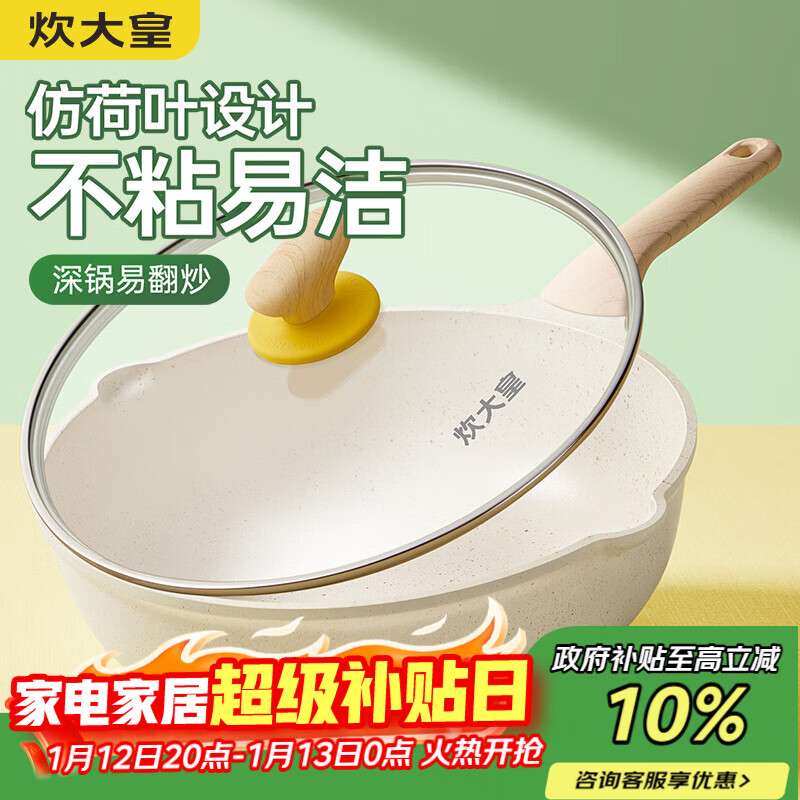 炊大皇 炒锅 麦饭石色不粘锅多功能少油烟炒菜锅平底32cm 电磁炉通用