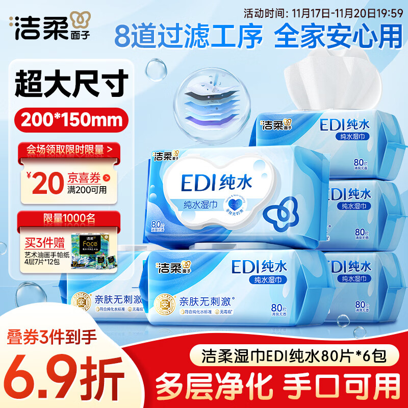 洁柔EDI纯水湿巾80抽*6包大码200*150八道净化洁肤柔婴儿湿纸巾无酒精
