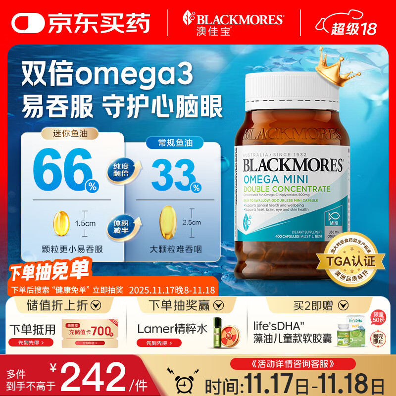 澳佳宝Blackmores双倍迷你鱼油软胶囊500mg深海Omega3小粒400粒 成年人