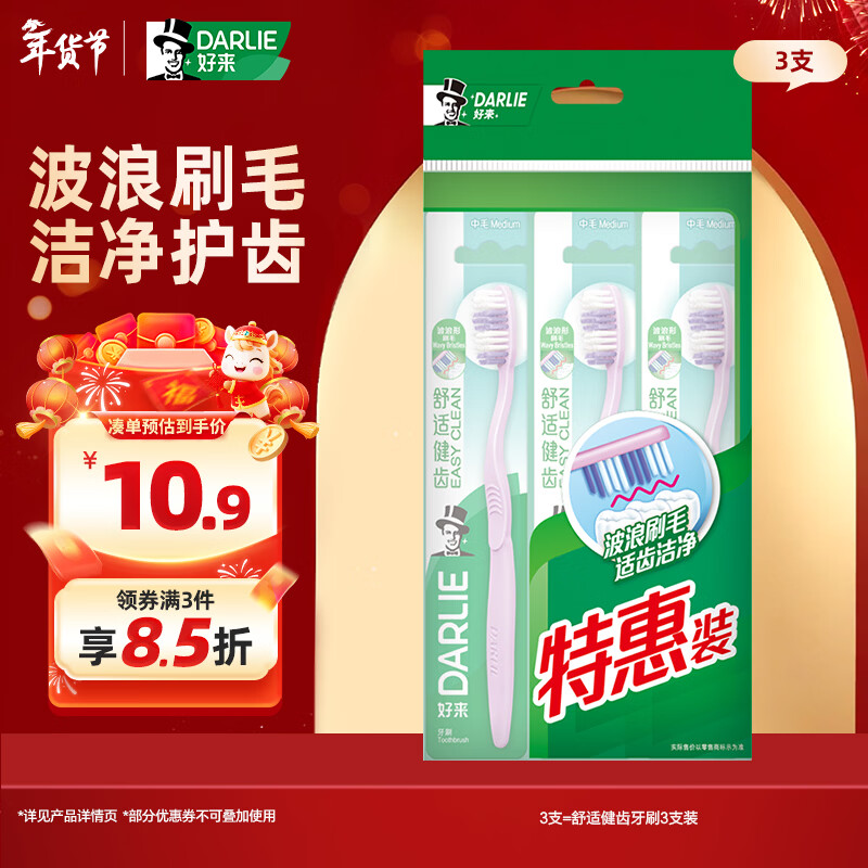 DARLIE好来(原黑人)舒适健齿中毛牙刷3支装 波浪刷毛 适齿洁净 便携装