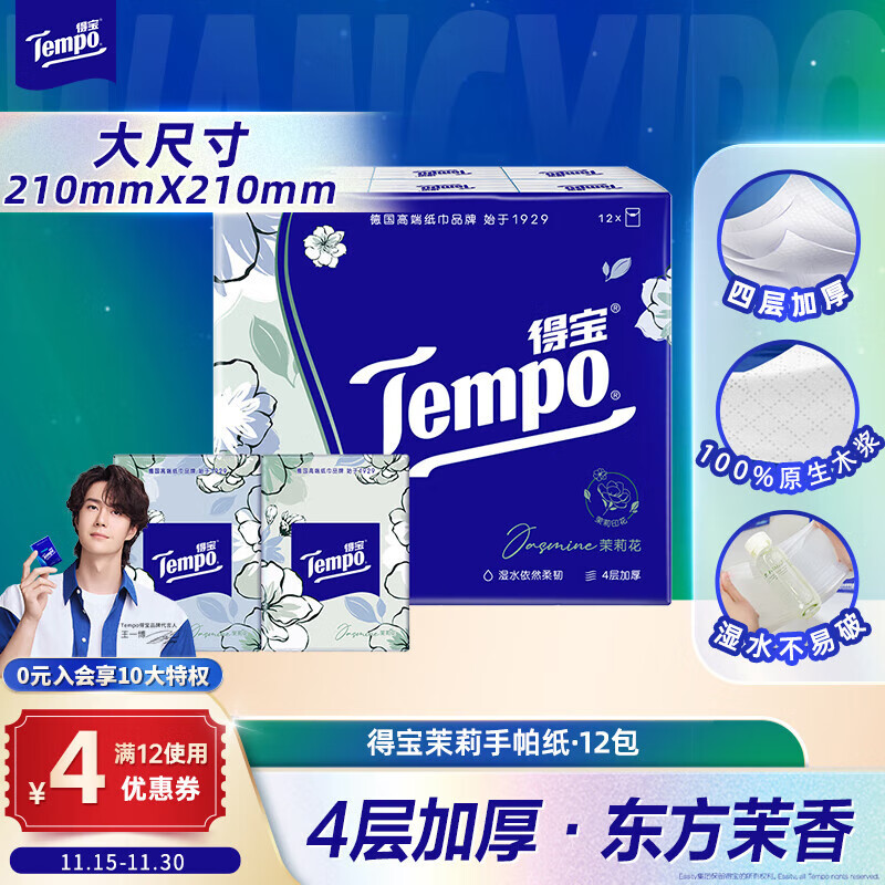 得宝(TEMPO)一博同款 手帕纸 茉莉花味4层7张*12包 湿水不破 纸巾小包 面巾纸