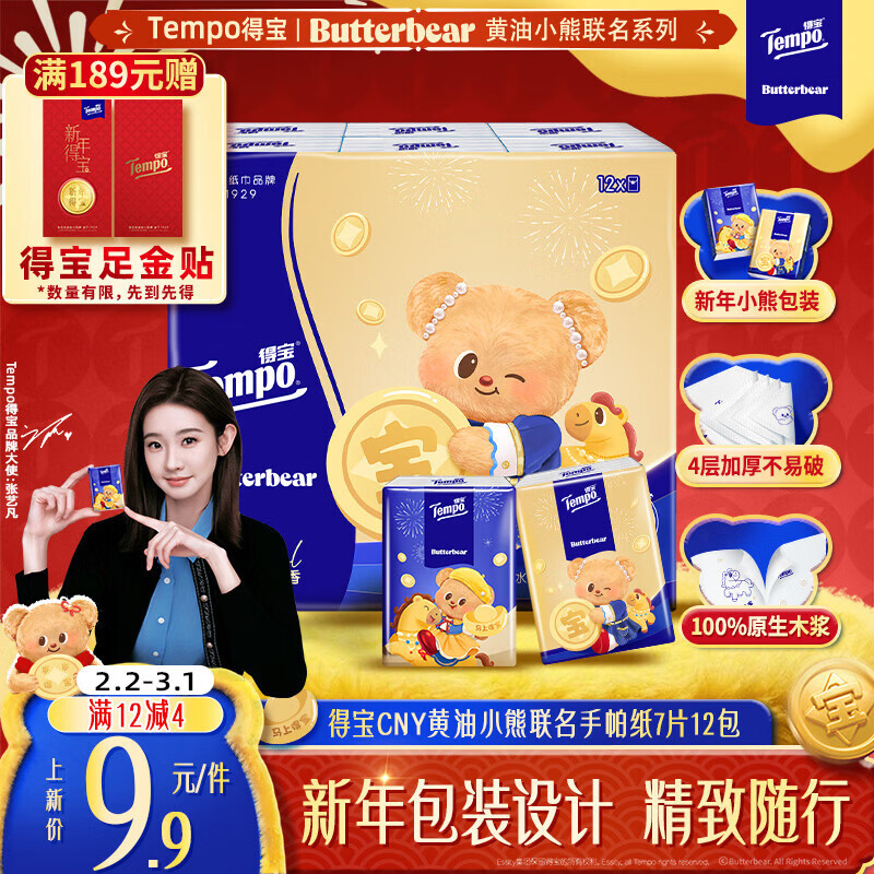得宝(TEMPO)黄油小熊新年限定款 无香印花纸手帕 4层7张*12包 对半撕小包纸巾
