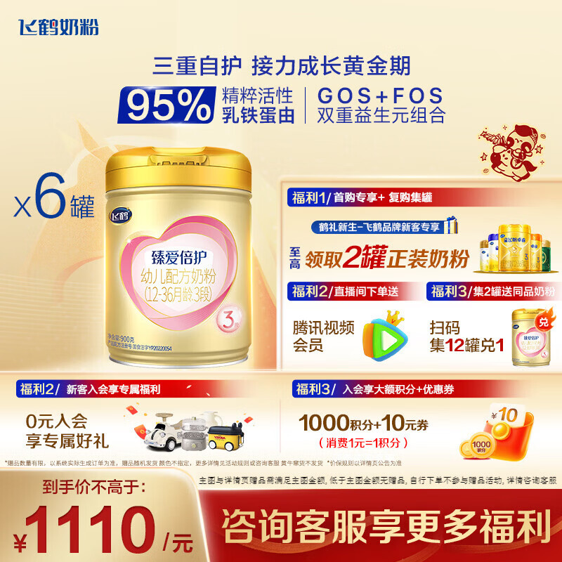 飞鹤臻爱倍护3段900g婴幼儿配方奶粉 育儿补贴(12-36个月适用) 6罐 (热销爆款)