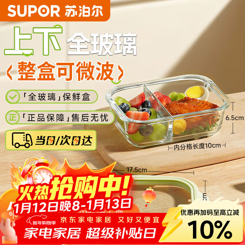 苏泊尔(SUPOR)保鲜盒两分隔餐盒上班族学生午餐便当盒微波炉可加热600mL青提绿