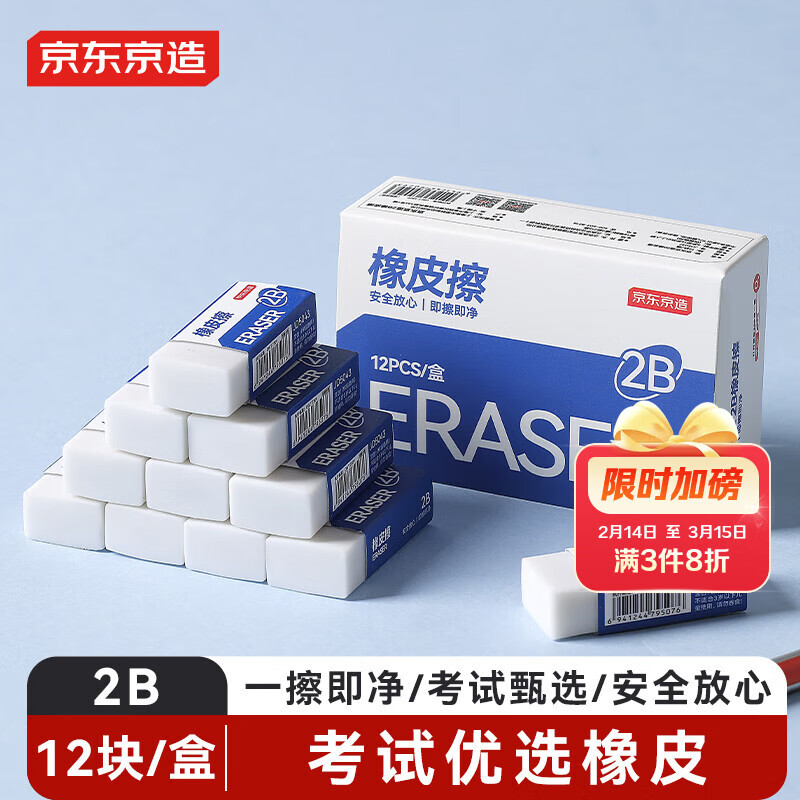 京东京造 12块2B橡皮擦 净白易擦少屑 开学文具考研中考高考学生考试美术绘图橡皮JD5037