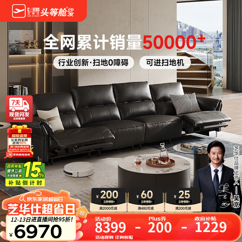 芝华仕(CHEERS)头等舱绅士智能椅真皮0靠墙客厅直排电动沙发大黑牛50795波特菲勒 【进扫地机】午夜黑-小四座-3.16M 优先发货(详询客服)
