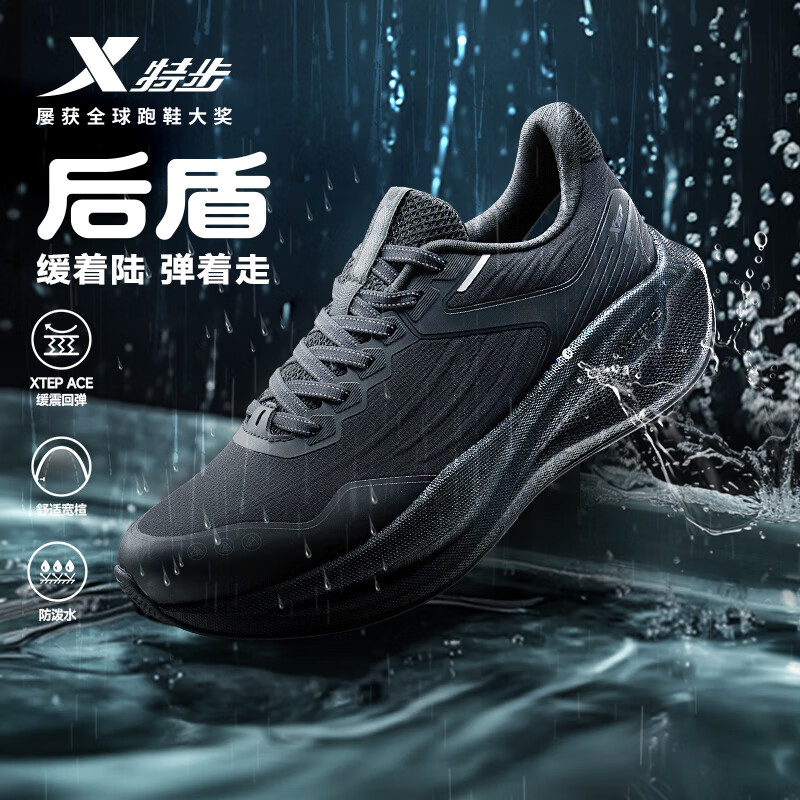 特步后盾跑步鞋运动鞋男鞋春夏季新款防水轻便减震回弹防滑跑鞋黑色