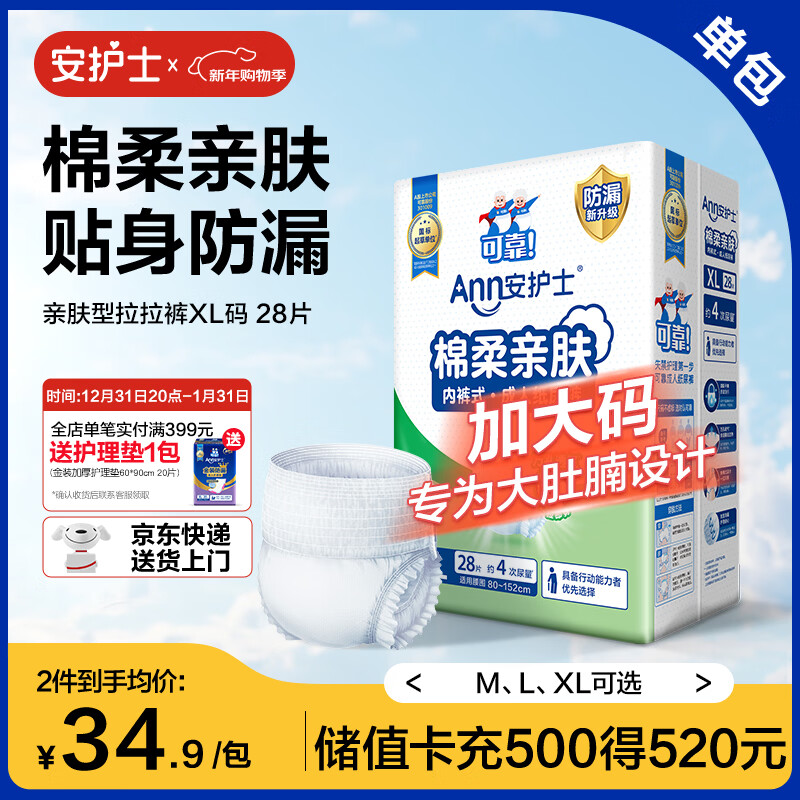 安护士棉柔亲肤成人拉拉裤XL28片 老年人尿不湿 孕产妇内裤型纸尿裤