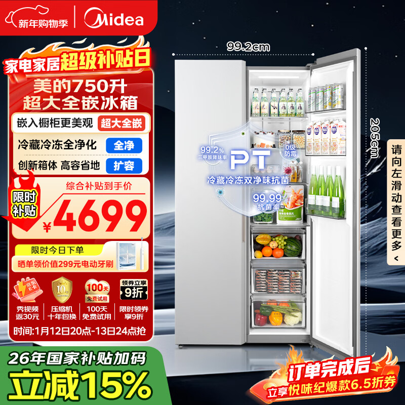 美的(Midea)大嵌750升对开门冰箱超薄零嵌入式超大容量一级能效变频风冷无霜BCD-750WKPZM(E)以旧换新国家补贴