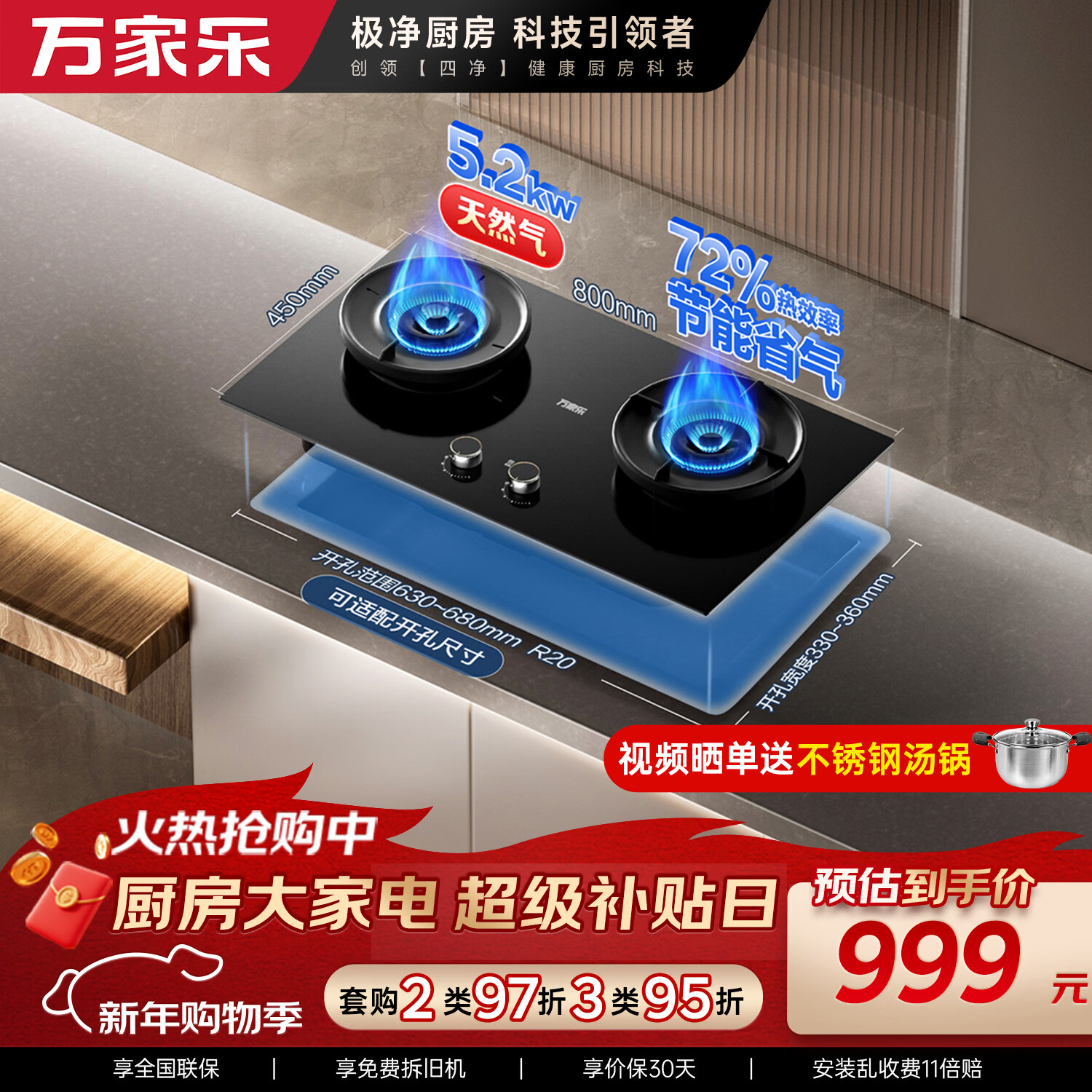 万家乐燃气灶【小鲸喜C8R5】台式嵌入式 5.2kw大火力72%高热效率灶具换新免扩孔嵌入式灶烟灶联动天然气