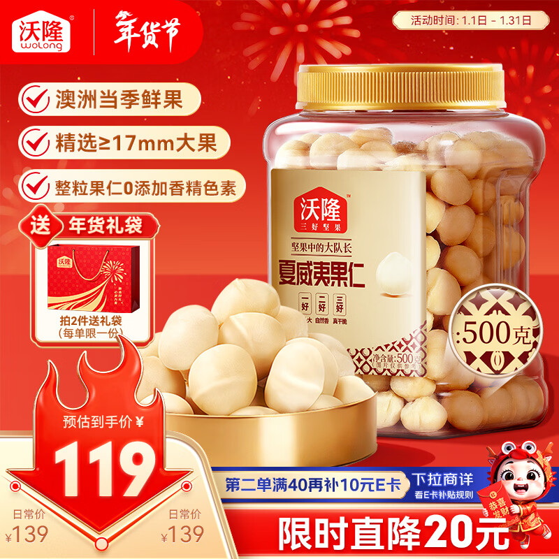 沃隆夏威夷果仁500g罐装原味去壳即食坚果炒货非油炸干果休闲零食