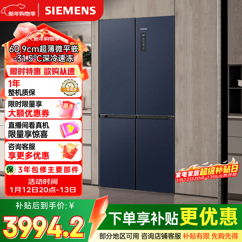 西门子(SIEMENS)无界十字星497L十字门冰箱超薄微平嵌 抑菌清新 一级能效 湖蕴蓝 KC505680EC 国家补贴