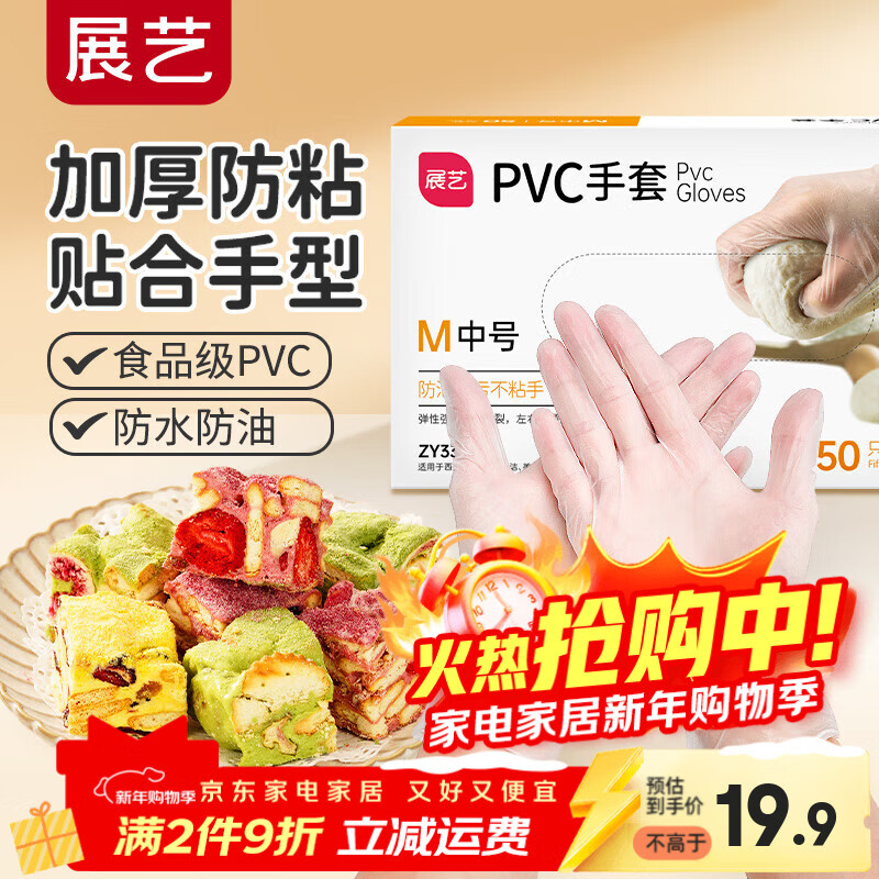 展艺一次性PVC手套加厚50只M号抽取式烧烤小龙虾雪花酥烘焙工具