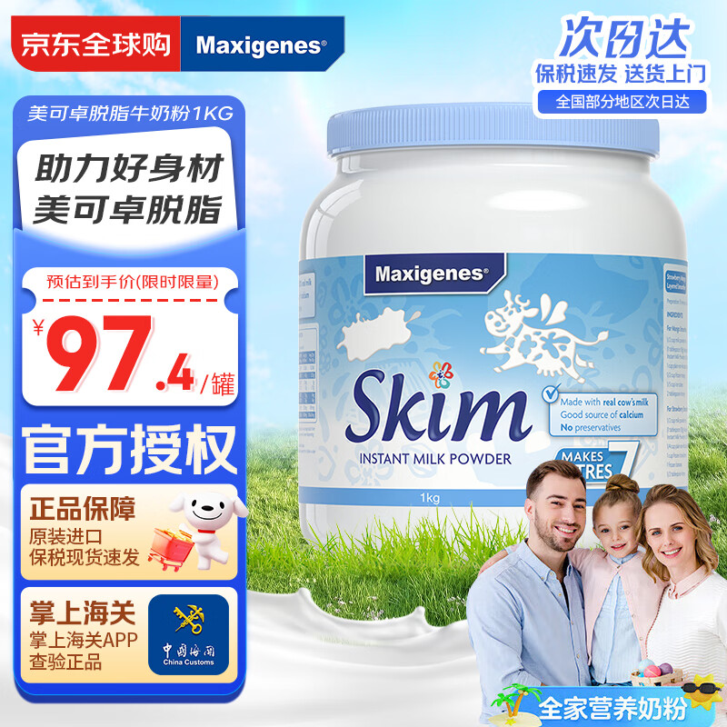 Maxigenes美可卓蓝妹子脱脂成人奶粉1kg罐0蔗糖高钙儿童学生中老年