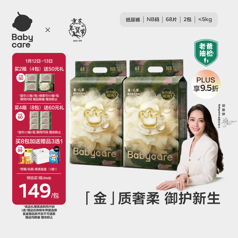 babycare金山茶花纸尿裤NB68片*2包(<5kg)新生儿婴儿尿不湿超薄透气花苞裤