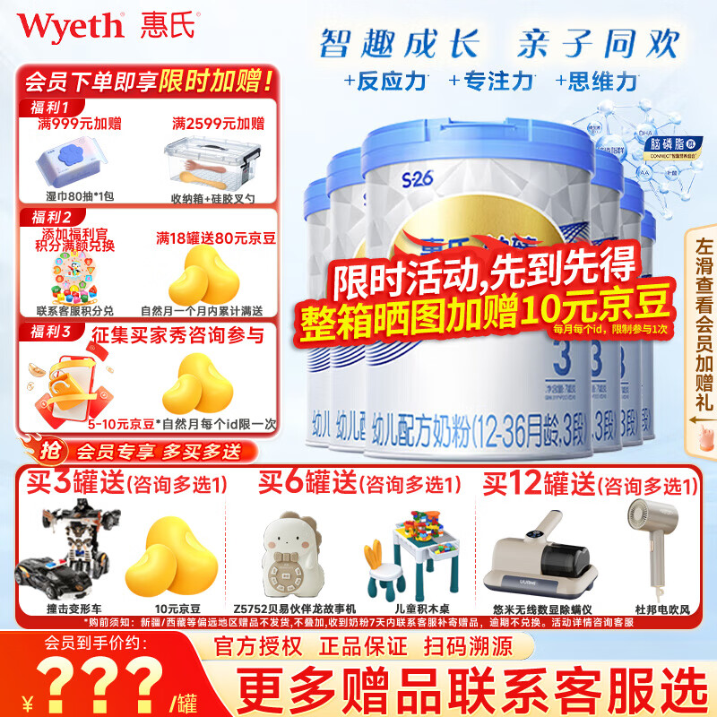 惠氏(Wyeth)【官方授权】S-26铂臻3段瑞士进口 配方奶粉 3段780g*6罐