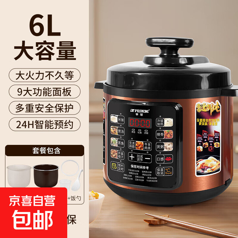 半球(PESKOE)电压力锅家用6升双胆大容量高压锅多功能蒸煮全自动电饭煲 电压力锅 6L 双内胆【陶瓷釉内胆+搪瓷内胆】
