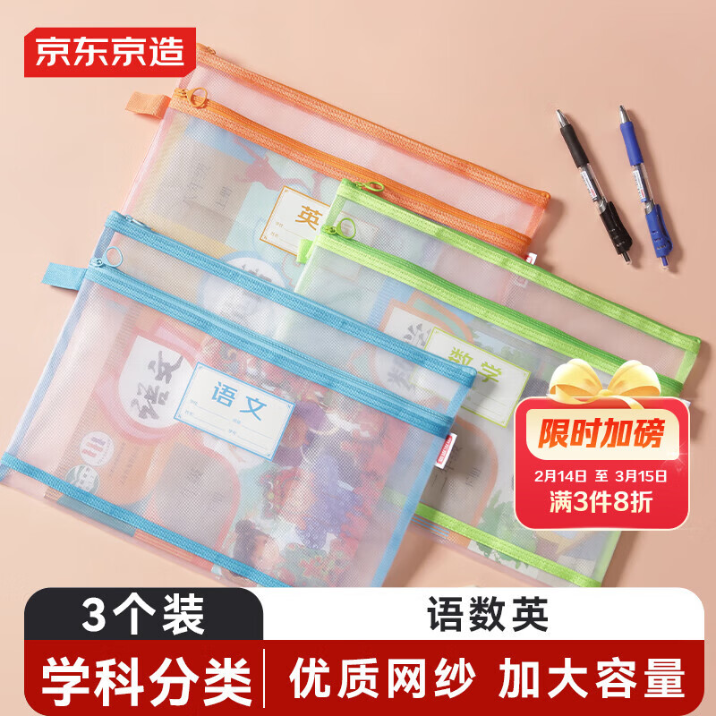 京东京造双层学科袋A4 小学生透明网纱科目袋分类袋 试卷课本资料收纳文件袋拉链袋 3个装(语数英)