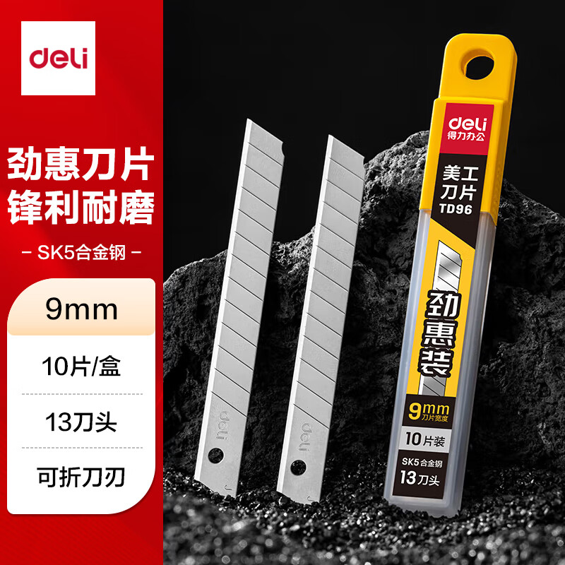 得力(deli)9mm美工刀片墙纸刀壁纸刀裁纸13刀头 安全快递开箱刀替换刀片10片/盒 TD96