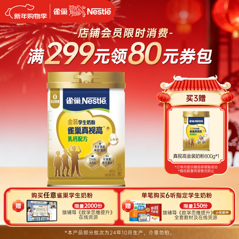 雀巢(Nestle)真视高金装学生奶粉高钙高锌800g叶黄素生牛乳青少年早餐营养奶粉