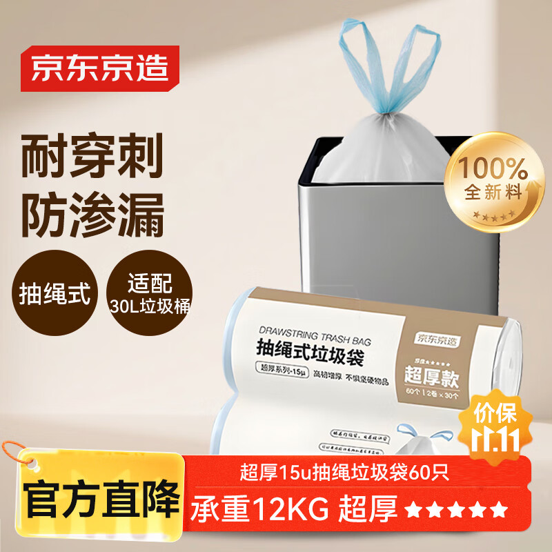 京东京造超厚抽绳垃圾袋(30L垃圾桶专用)46*75cm*60只 15u防刺破厨房客厅