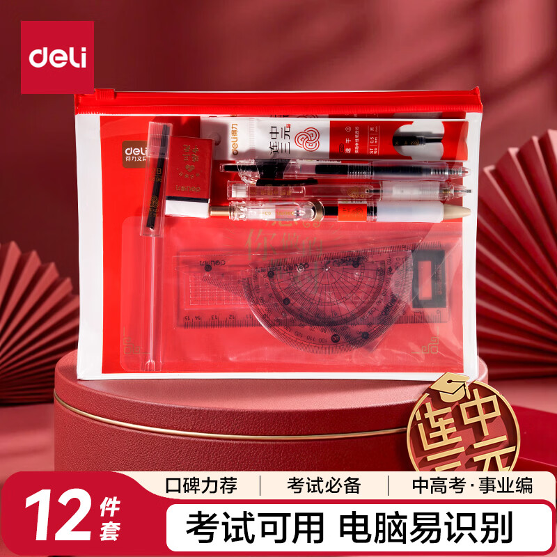 得力连中三元考试套装12件套 中性笔涂卡2B自动铅笔套尺橡皮 考中高考加油 考试中高考专用6696