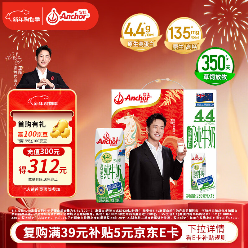 安佳(Anchor)4.4g蛋白质高钙全脂牛奶250ml*15盒 新西兰进口草饲牛奶礼盒