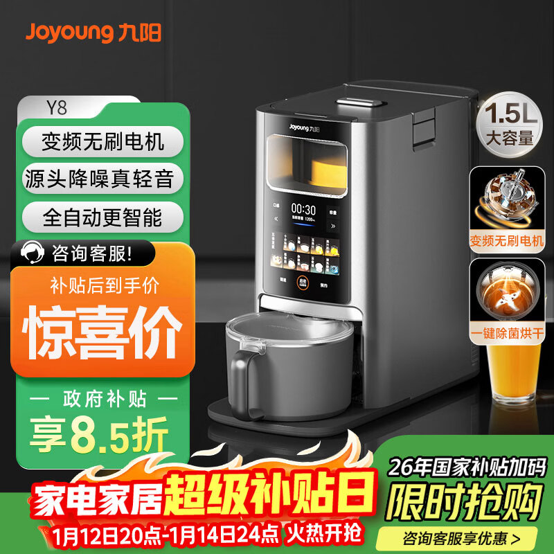 九阳轻音免手洗家用全自动变频破壁料理机器人2-4人五谷杂粮豆浆32分贝1.5L破壁机Y8国家补贴