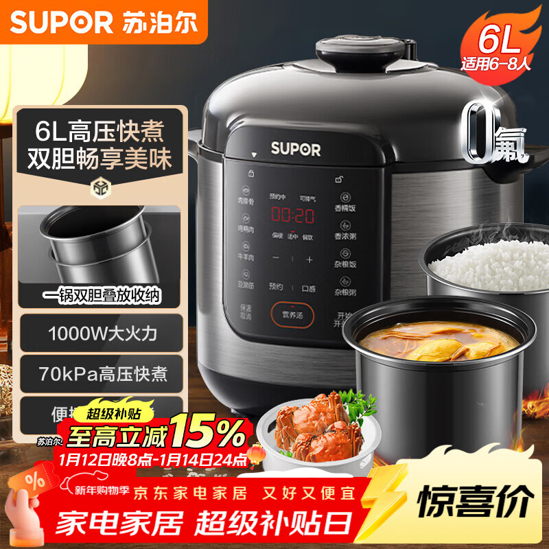 苏泊尔(SUPOR)电压力锅6L双胆配蒸笼智能预约多功能煲汤煮饭SY-60YC6006电饭煲高压锅6-8人