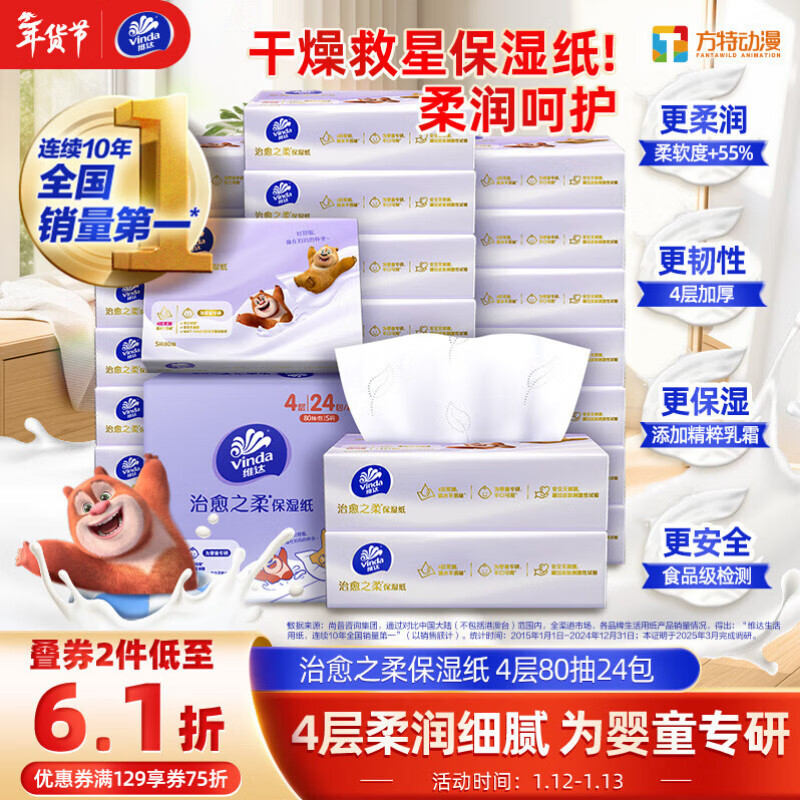 维达(Vinda)抽纸 保湿纸巾4层80抽*24包 加厚婴儿乳霜纸云柔巾 宝宝专用 整箱
