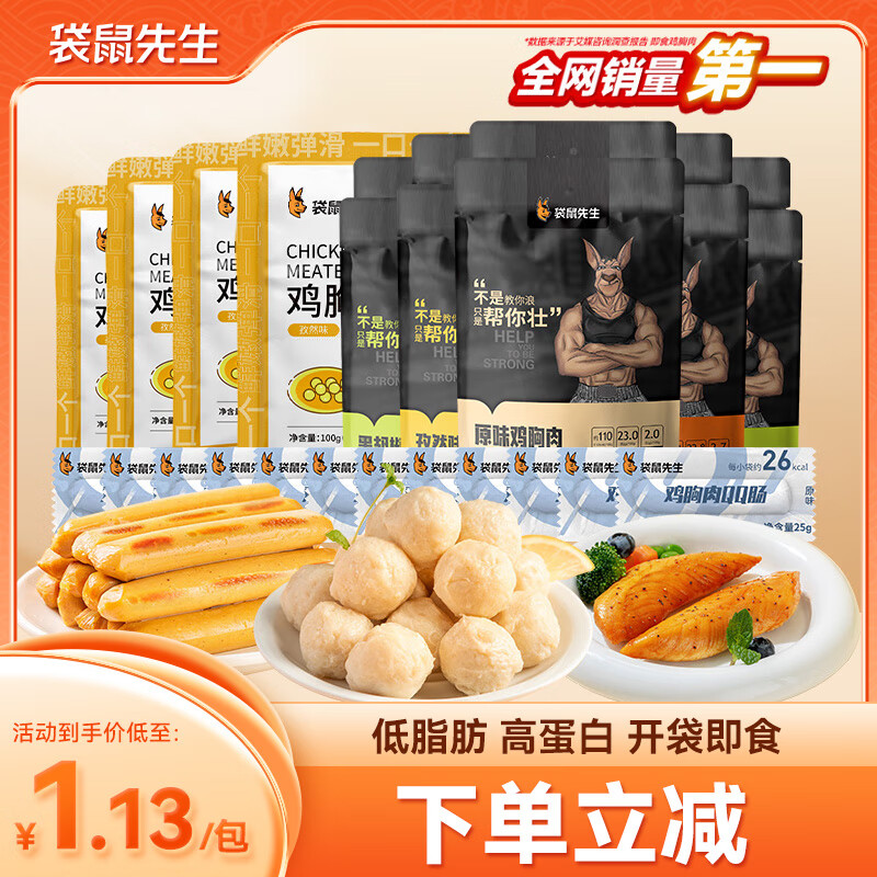 袋鼠先生70包鸡胸肉组合1650g健康即食健身代餐低脂高蛋白肉类零食大礼包