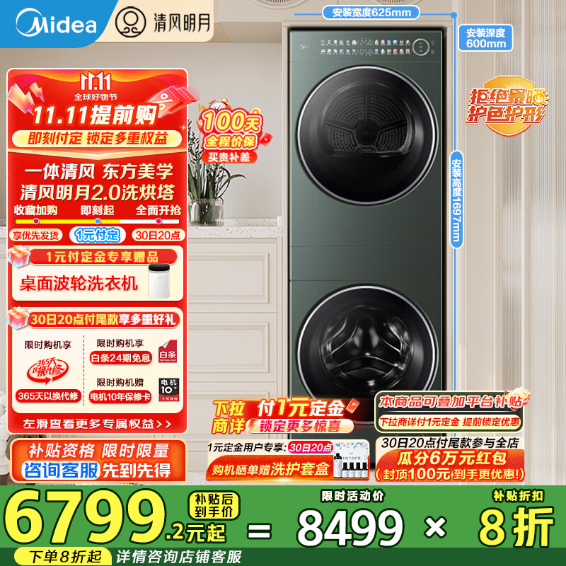 美的(Midea)洗烘套装10kg滚筒洗衣机+变频热泵烘干机纯平全嵌【清风明月2.0洗烘塔】以旧换新 MGH20A-G+MAX远山青【纯色款洗烘塔】