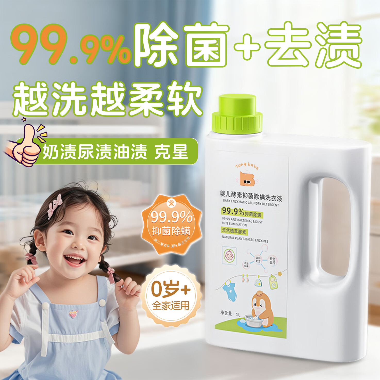 童贝比婴幼儿0-3岁酵素洗衣液儿童宝宝专用母婴级洗护抑菌除螨柔顺剂