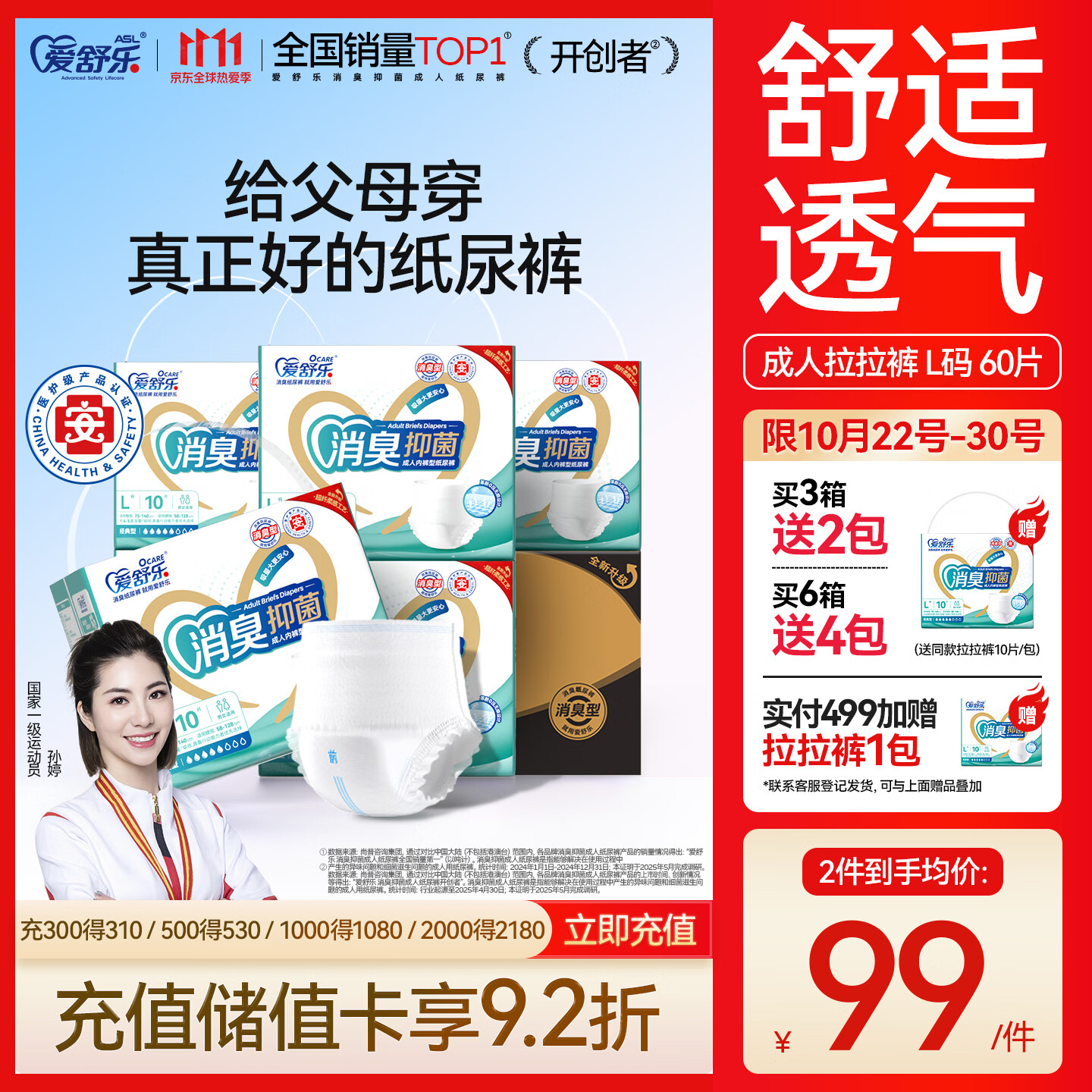 爱舒乐消臭抑菌成人拉拉裤L60片(臀围75~140cm) 内裤型纸尿裤尿不湿老人