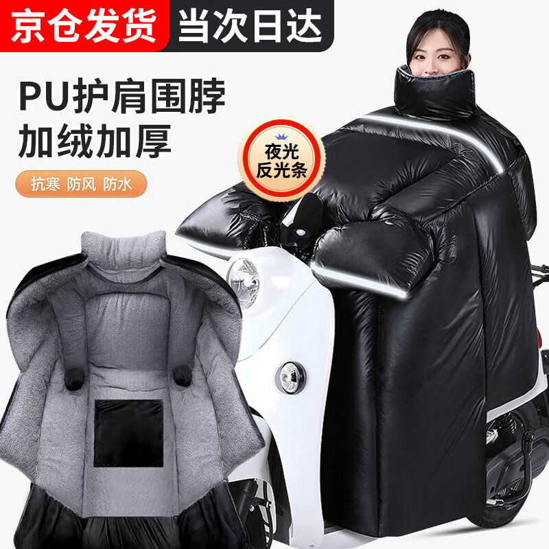 京家洁电动车挡风被冬季加绒加大加厚2025新款电瓶车防水挡风被摩托车 PU小羊皮-黑色【护肩围脖加厚款】