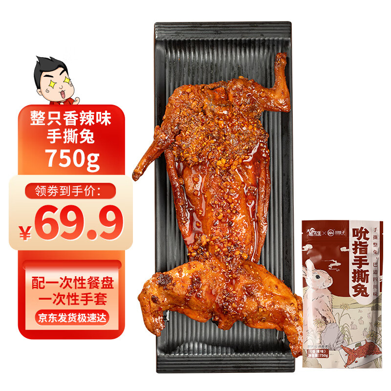 大嘴先生香辣手撕兔750g 冷吃兔麻辣兔肉烤全兔下酒菜 开袋即食
