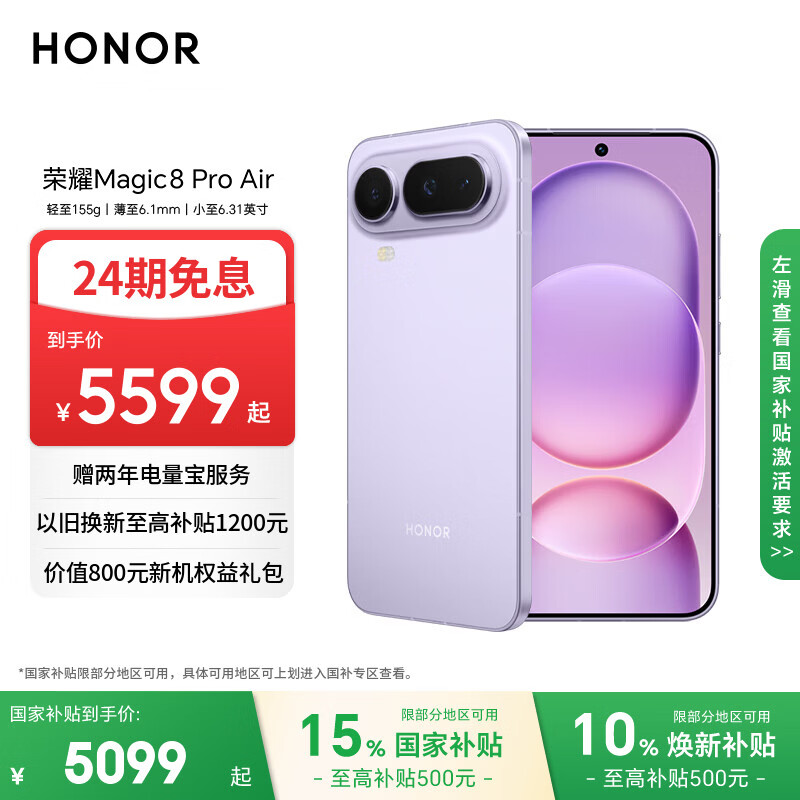 荣耀Magic8 Pro Air 16+512 仙紫 轻至155g 薄至6.1mm 小至6.31英寸 全焦段闪光人像 AI手机 国家补贴