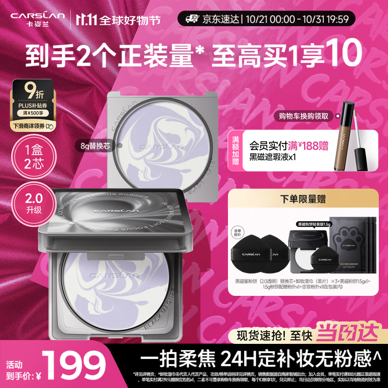 卡姿兰(Carslan)黑磁粉饼2.0升级嘭嘭紫(8g正装+8g替芯)定妆控油遮瑕散粉持久防汗
